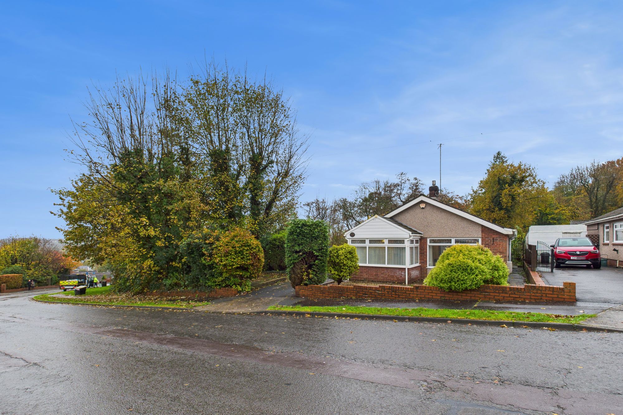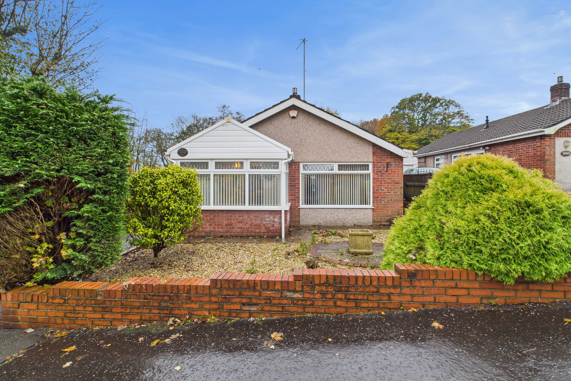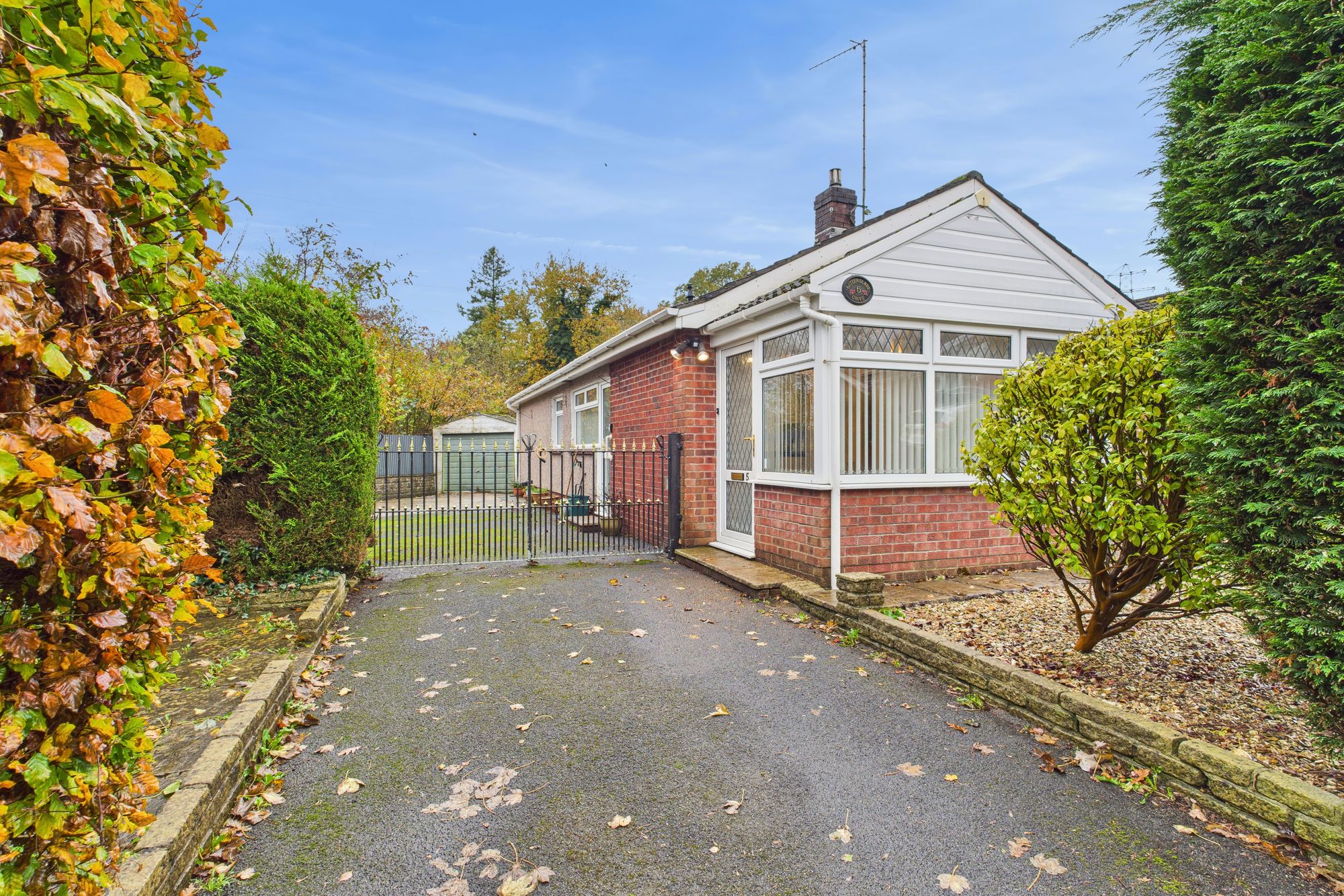 The bungalow sits on an excellent plot, enjoying a sense of privacy with mature hedging and low-maintenance landscaped gardens to the front. A gated driveway runs alongside the property leading to a detached garage, ensuring ample off-road parking.