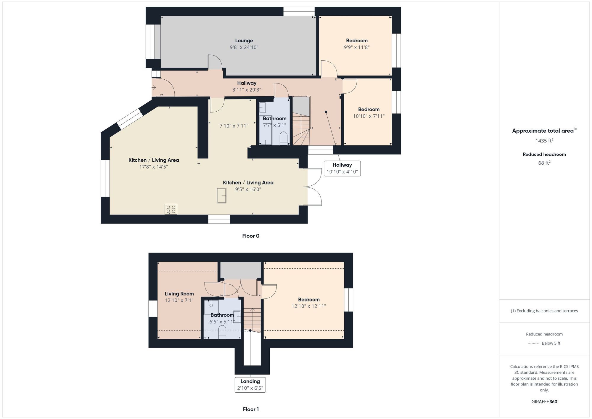 17' 8" x 14' 5" (5.38m x 4.39m) / 16' 0" x 9' 5" (4.88m x 2.87m) / 7' 11" x 7' 10" (2.41m x 2.39m)