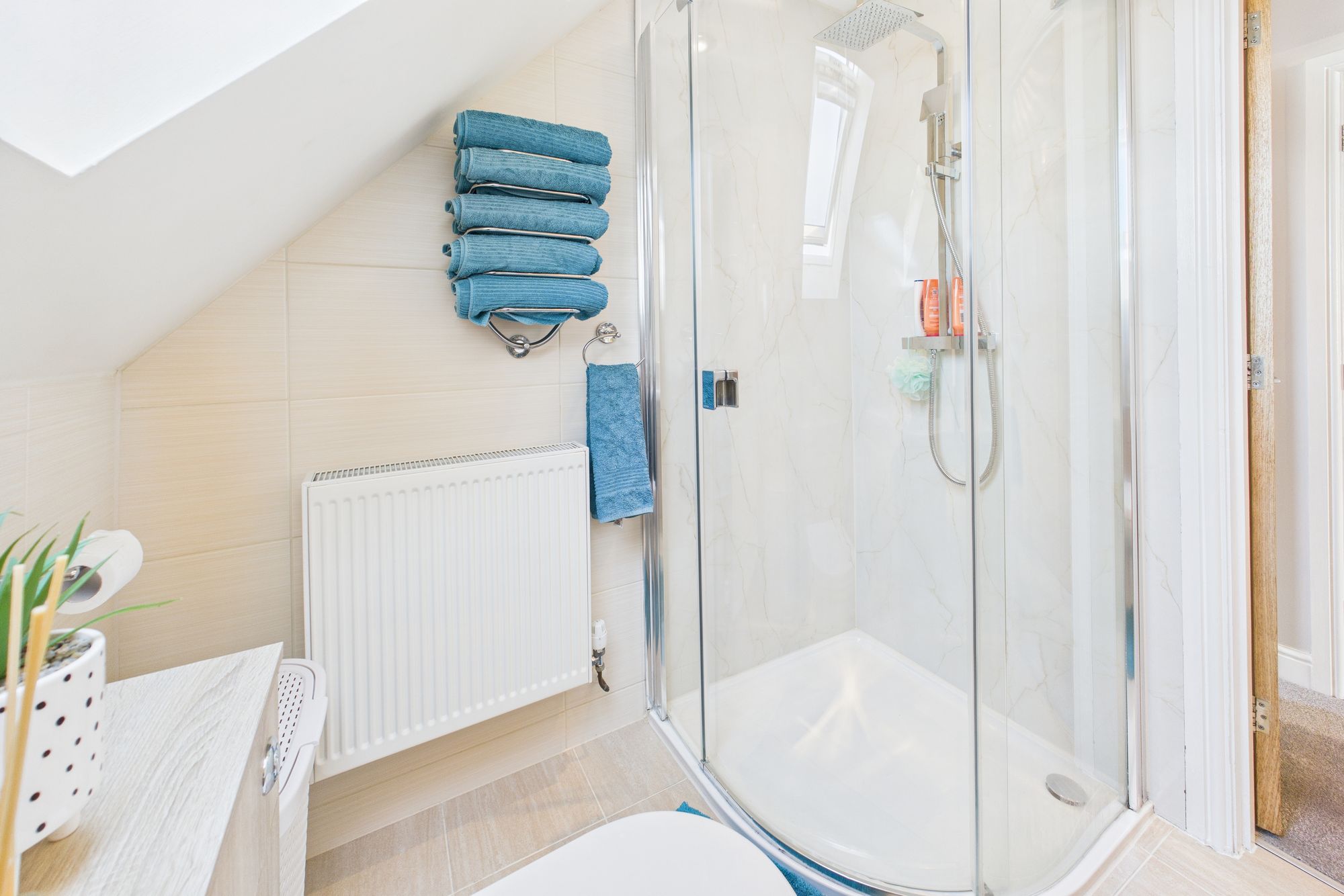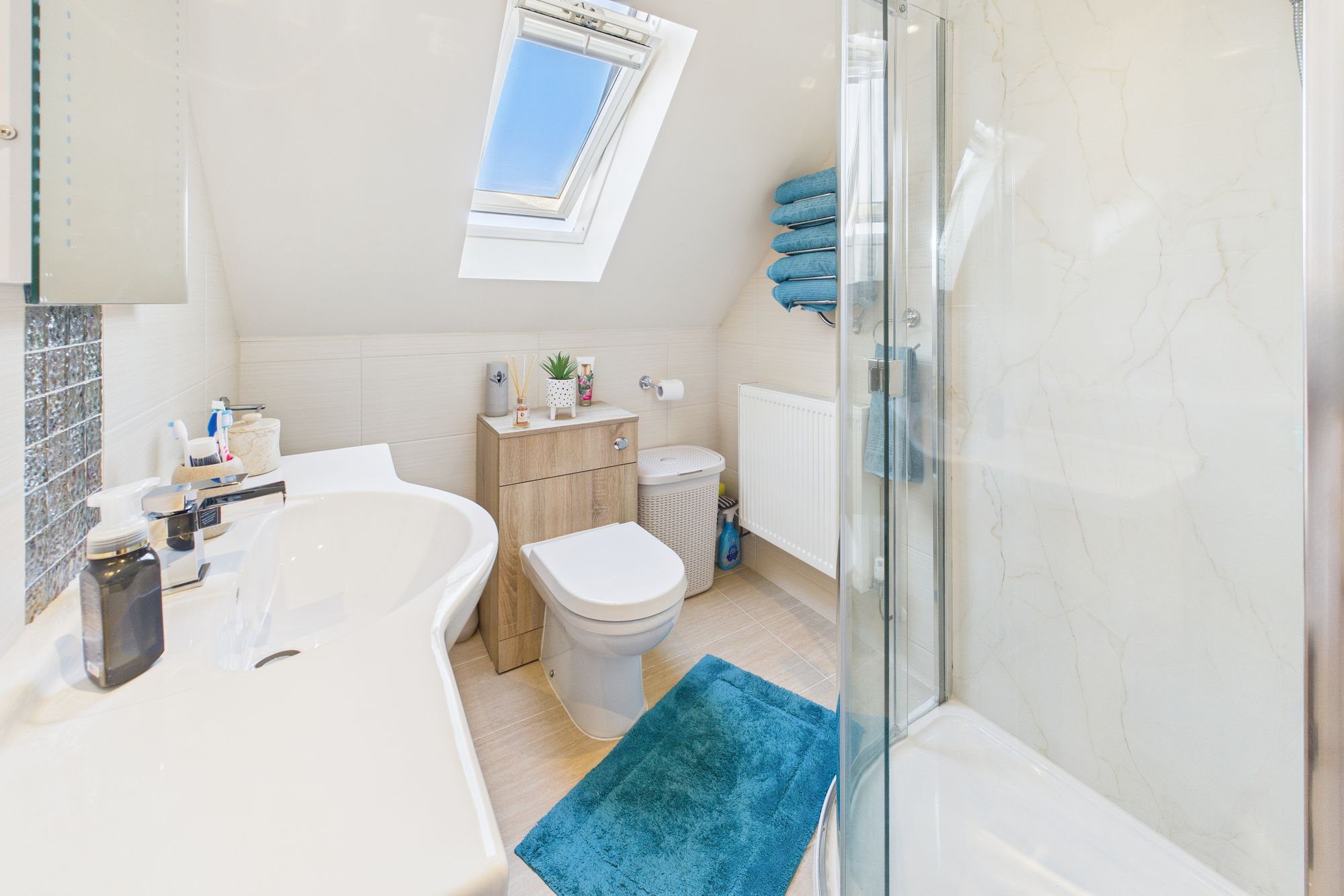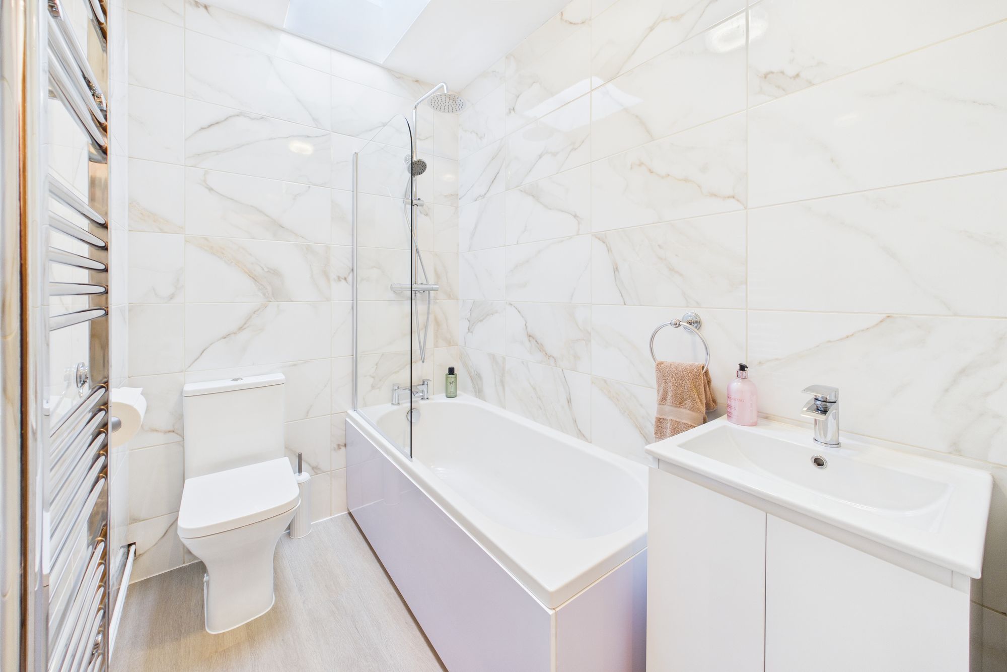The property boasts well-proportioned bedrooms, each tastefully decorated, with large windows that flood the rooms with natural light. The modern bathrooms are finished to a high standard, featuring contemporary tiling, and chrome fixtures.