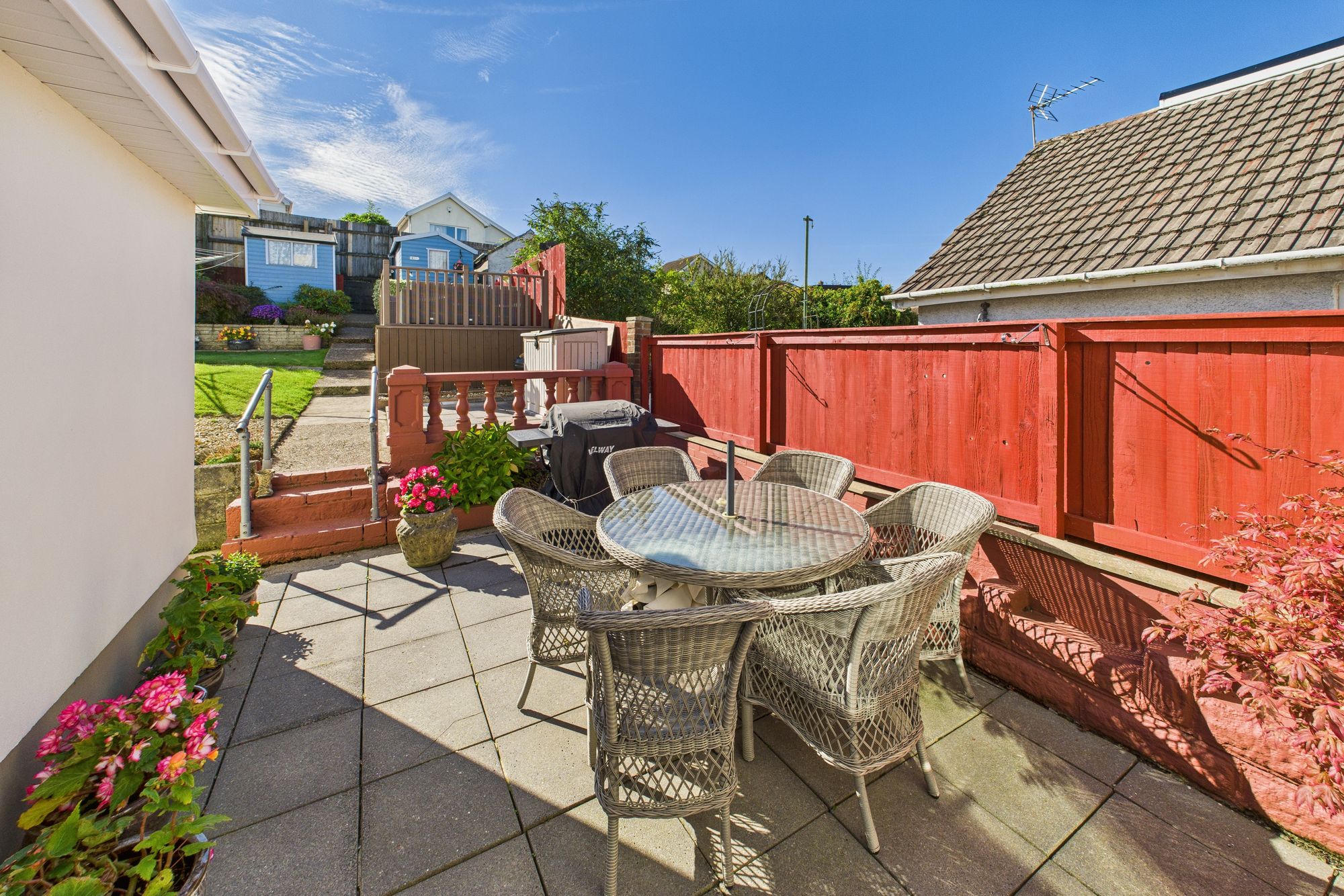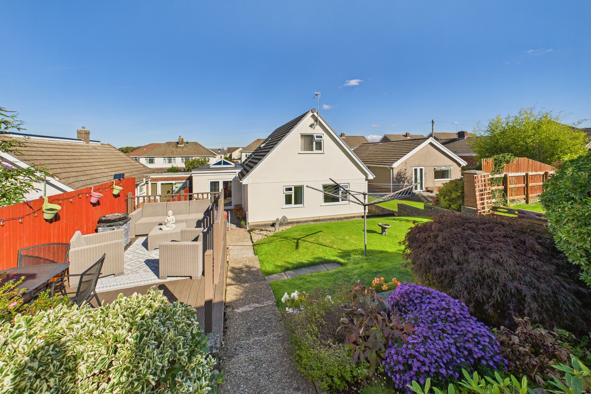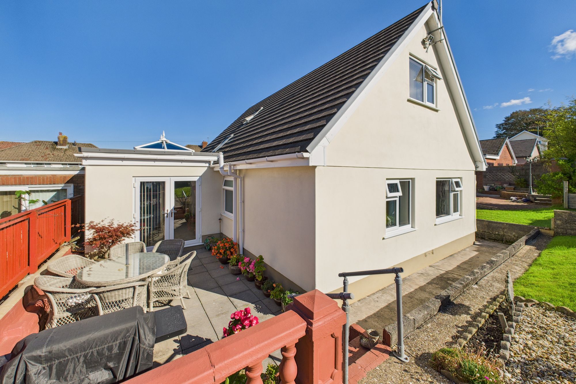 Outside, the landscaped rear garden is a private haven, complete with a patio, raised seating area, and colourful planted borders - perfect for alfresco dining and summer gatherings. To the front, a generous driveway provides ample off-road parking.