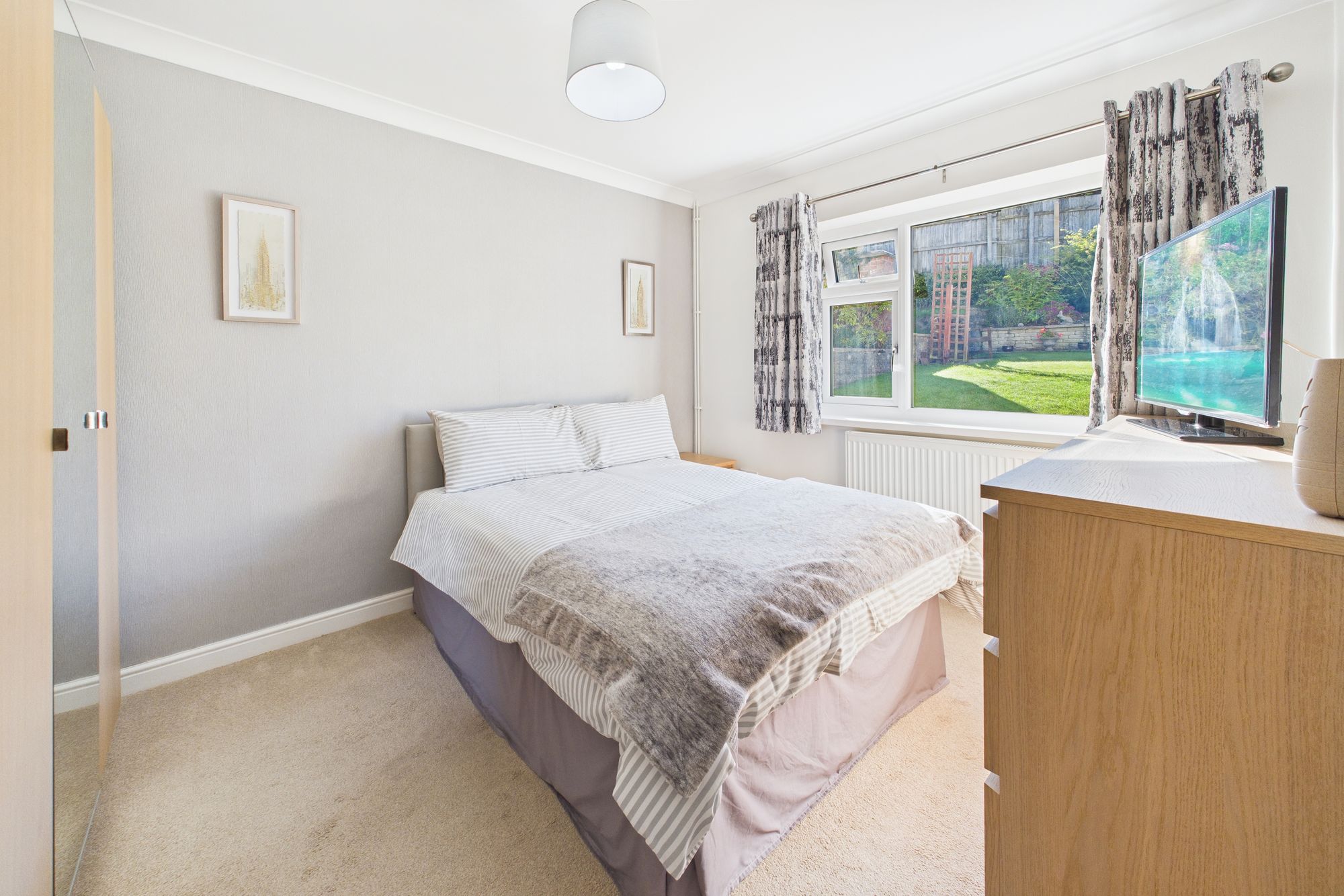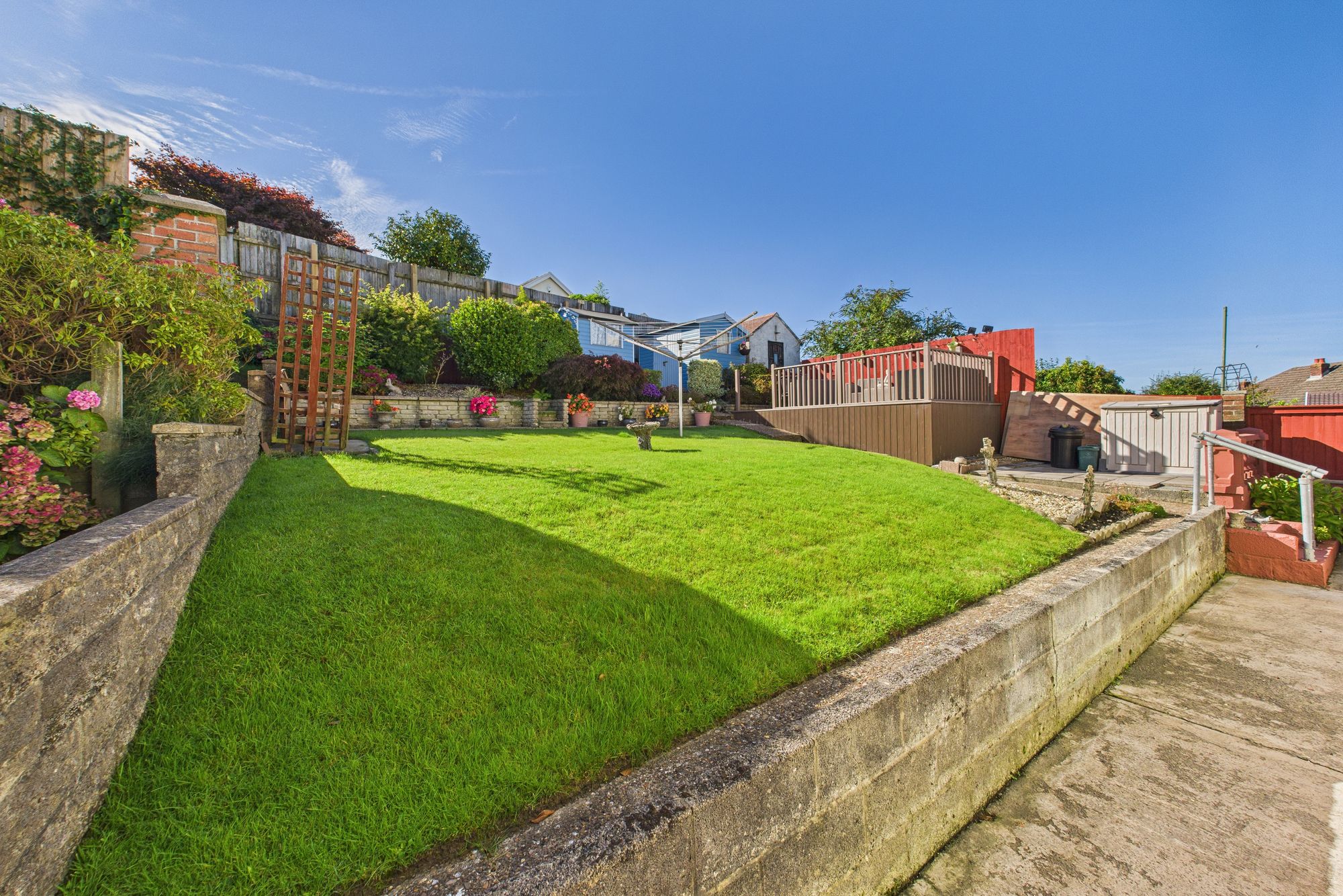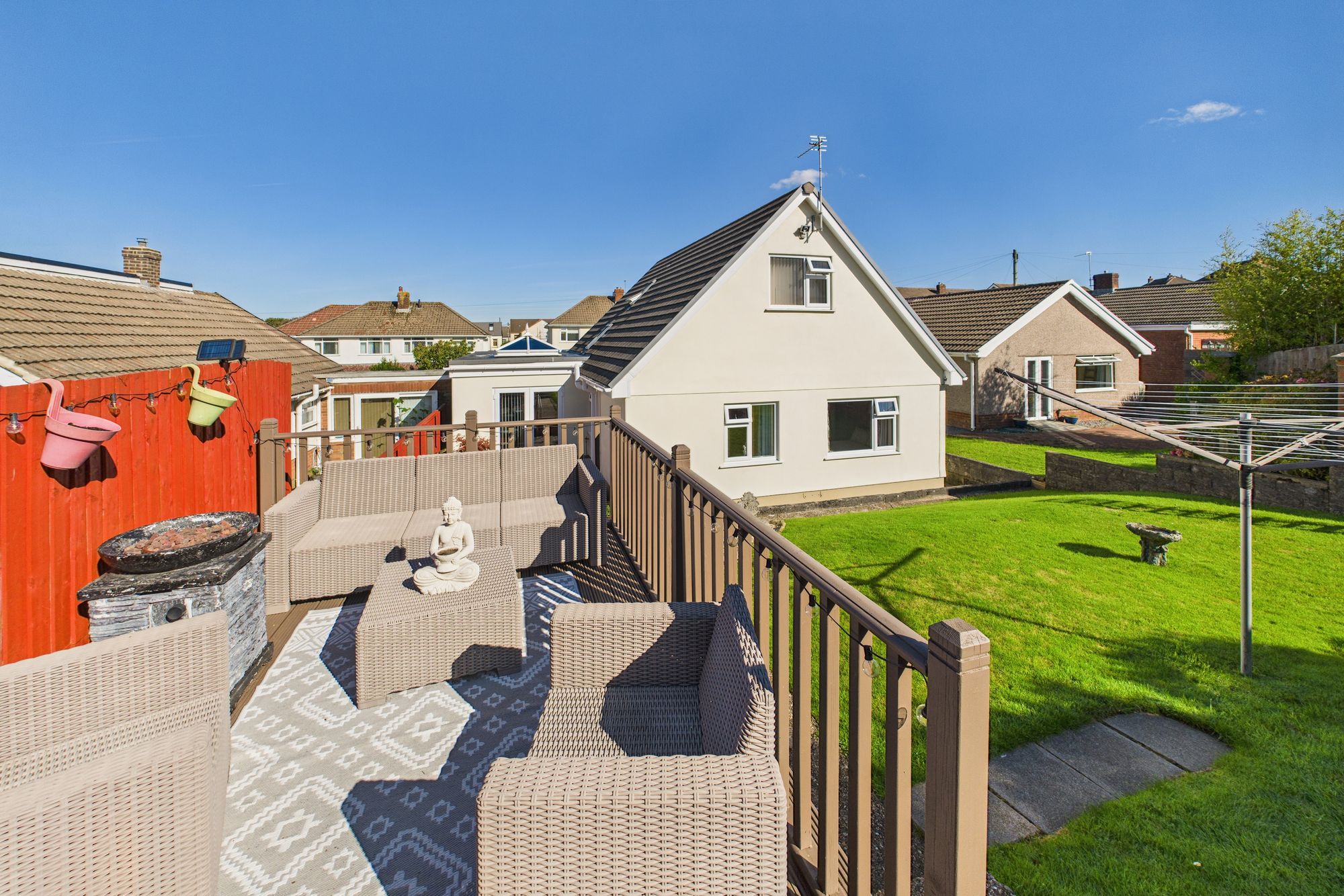 Outside, the landscaped rear garden is a private haven, complete with a patio, raised seating area, and colourful planted borders - perfect for alfresco dining and summer gatherings. To the front, a generous driveway provides ample off-road parking.