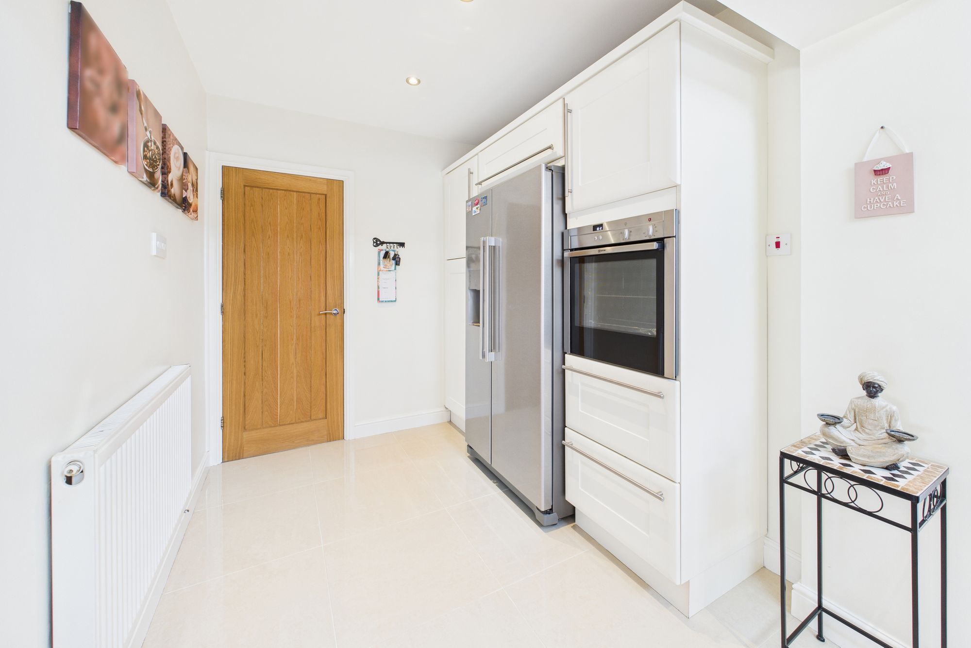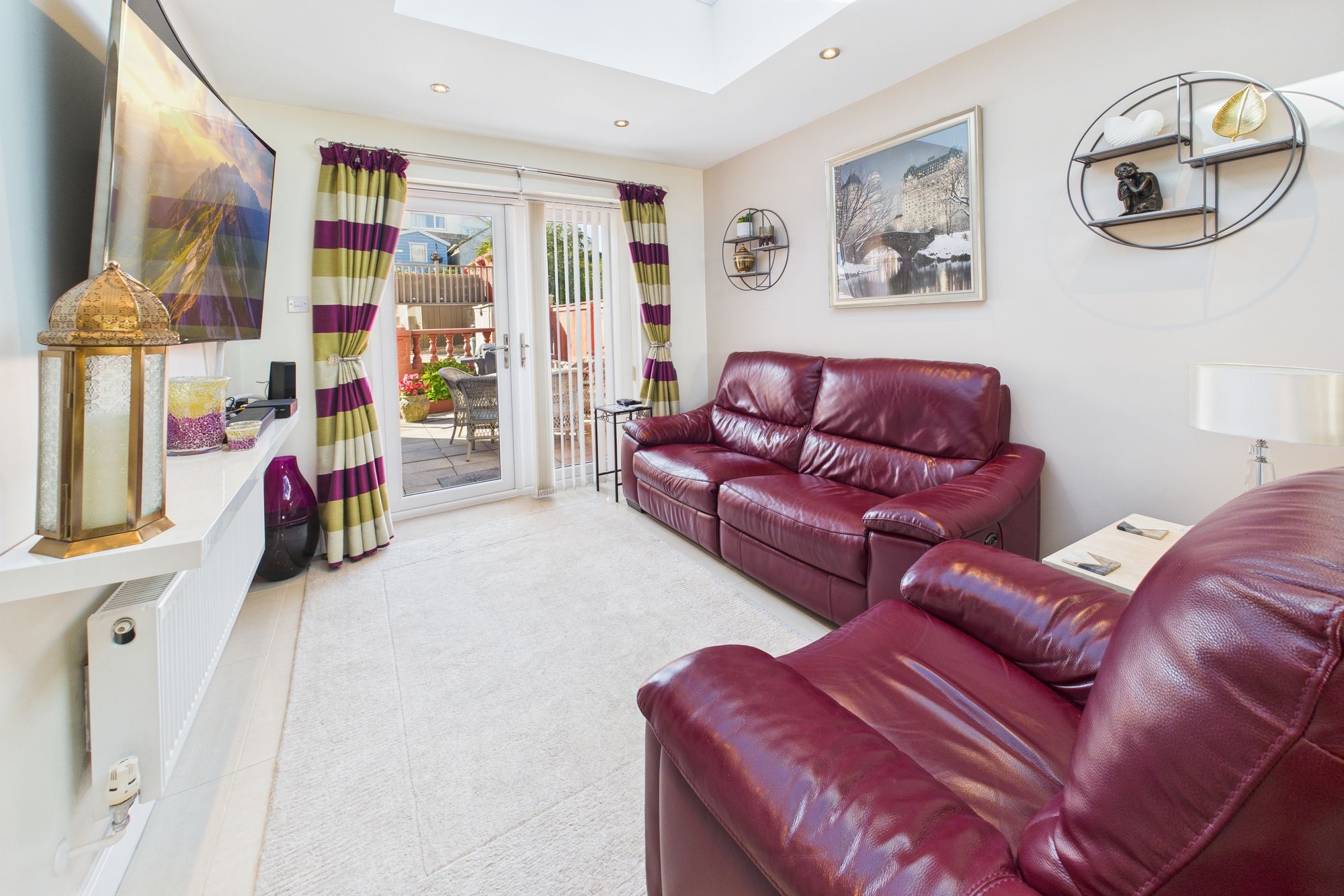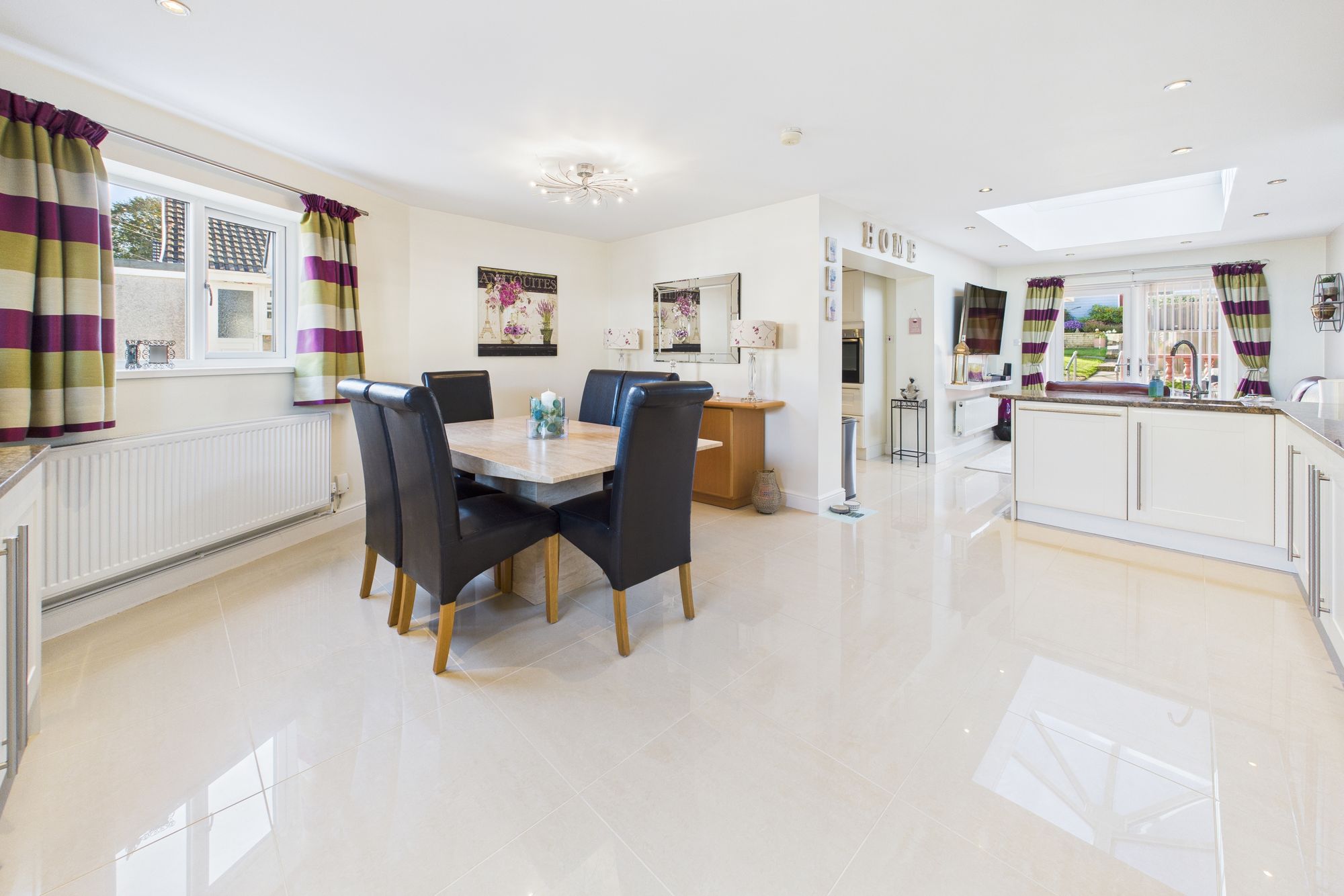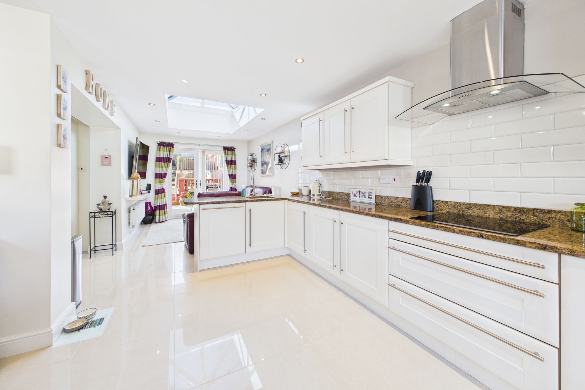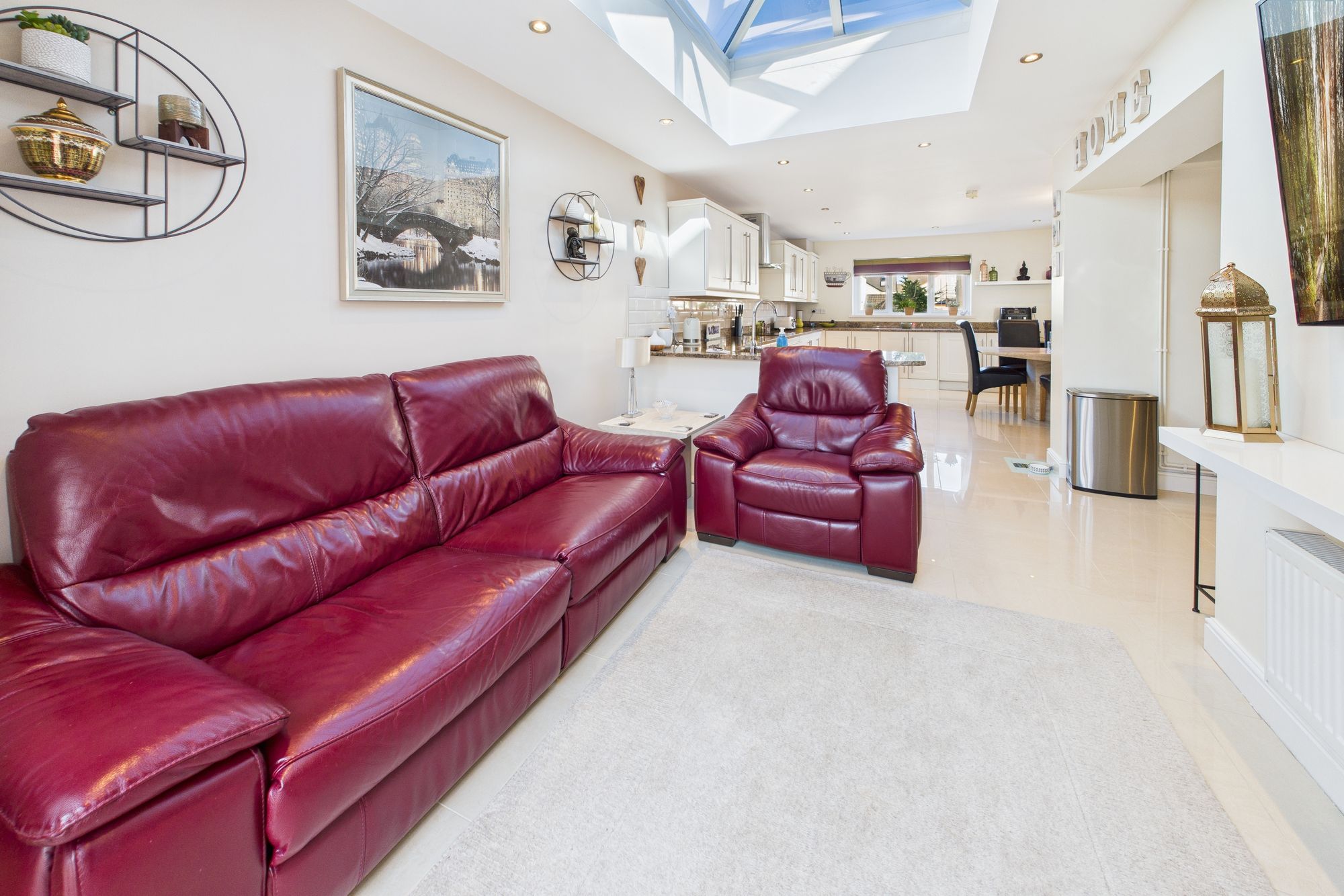 Step inside and you'll find a stunning open-plan kitchen, dining and living area - the true heart of the home. With glossy tiled flooring, skylight windows, and French doors leading out to the garden, this light-filled space is ideal for both entertaining and everyday family life. The sleek fitted kitchen offers ample storage, integrated appliances, and polished worktops, flowing seamlessly into a spacious dining area and comfortable lounge with garden views.
