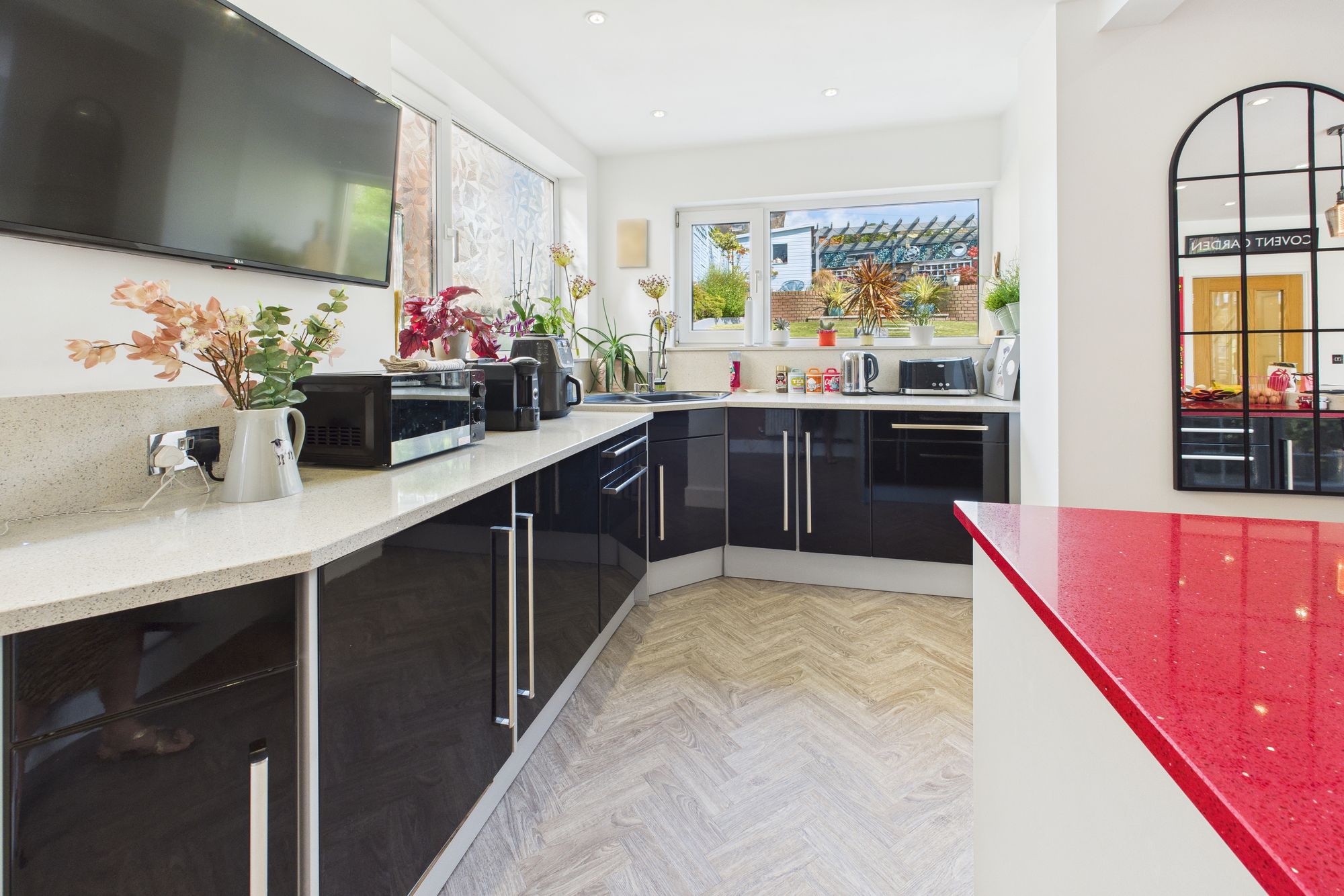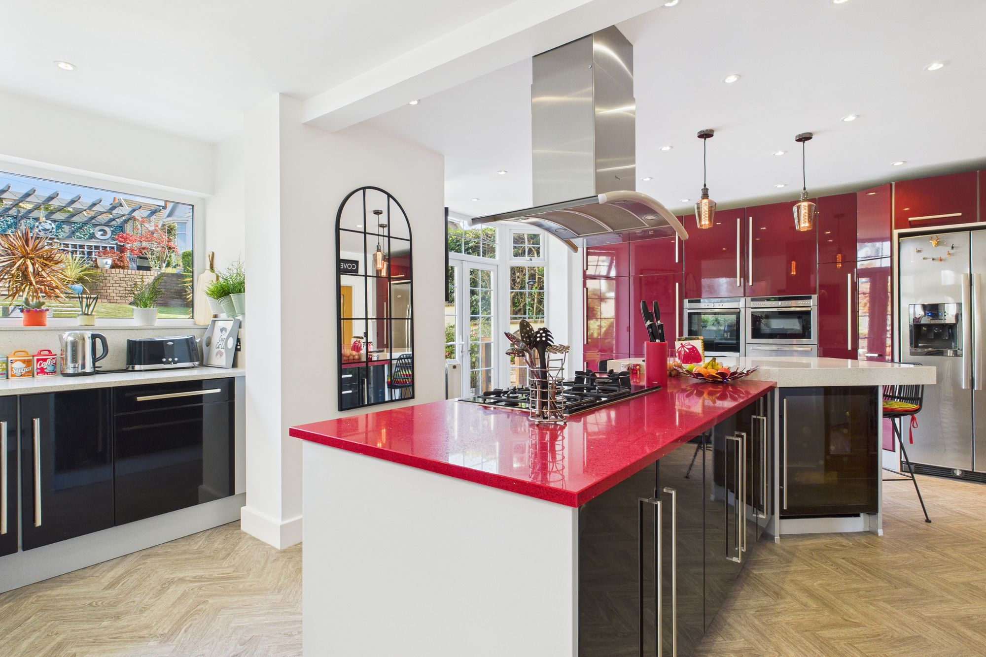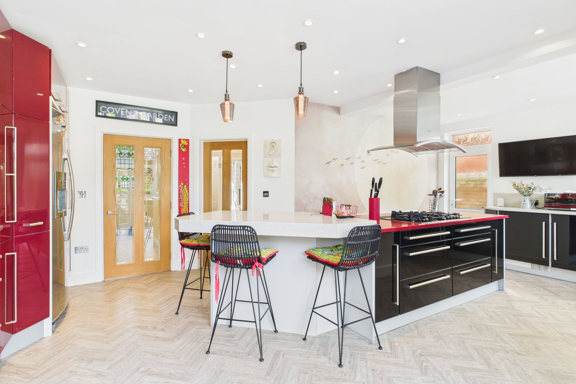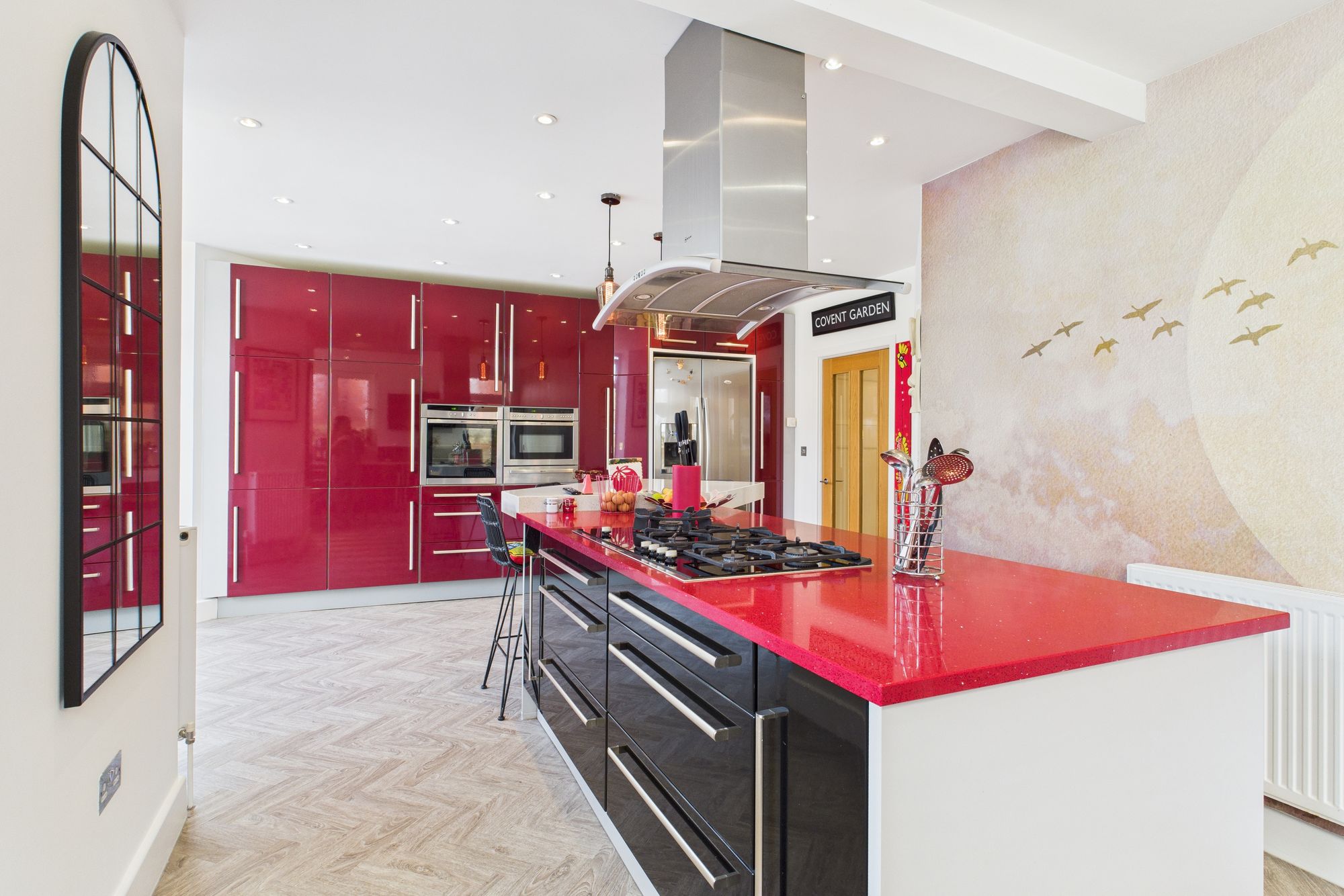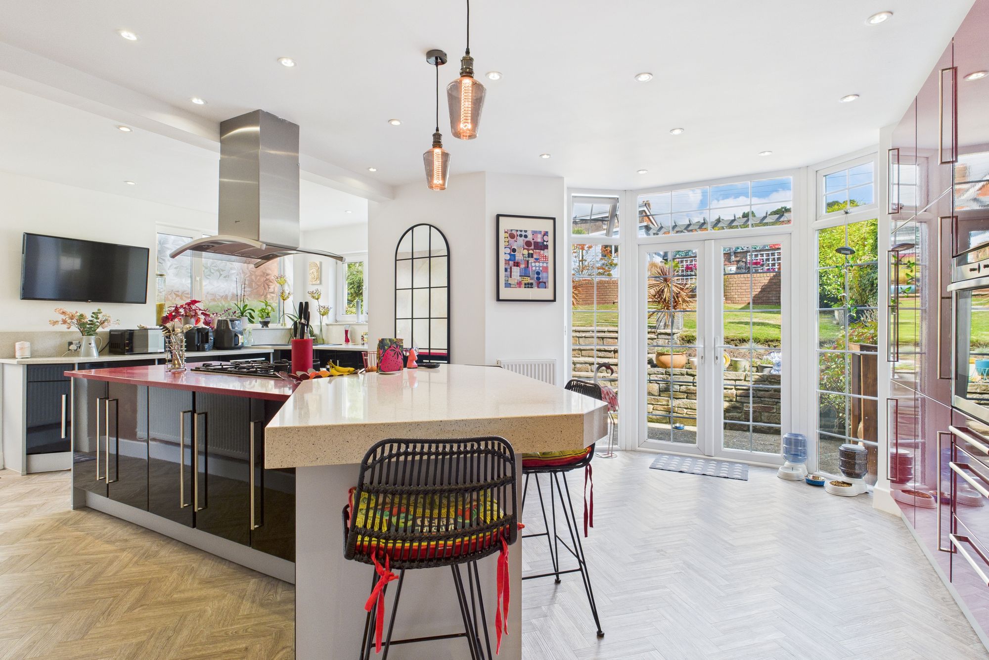 A contemporary kitchen boasts high gloss cabinetry, integrated appliances, and a central island with breakfast bar seating, perfect for casual dining and entertaining.