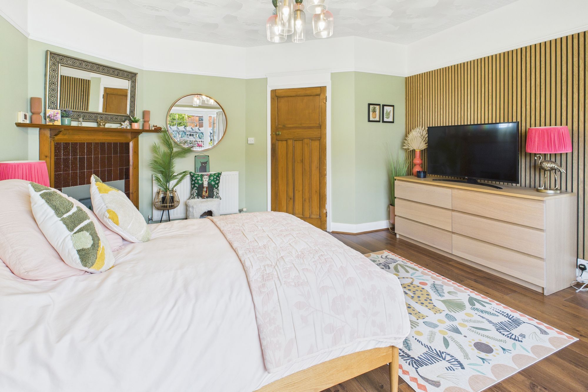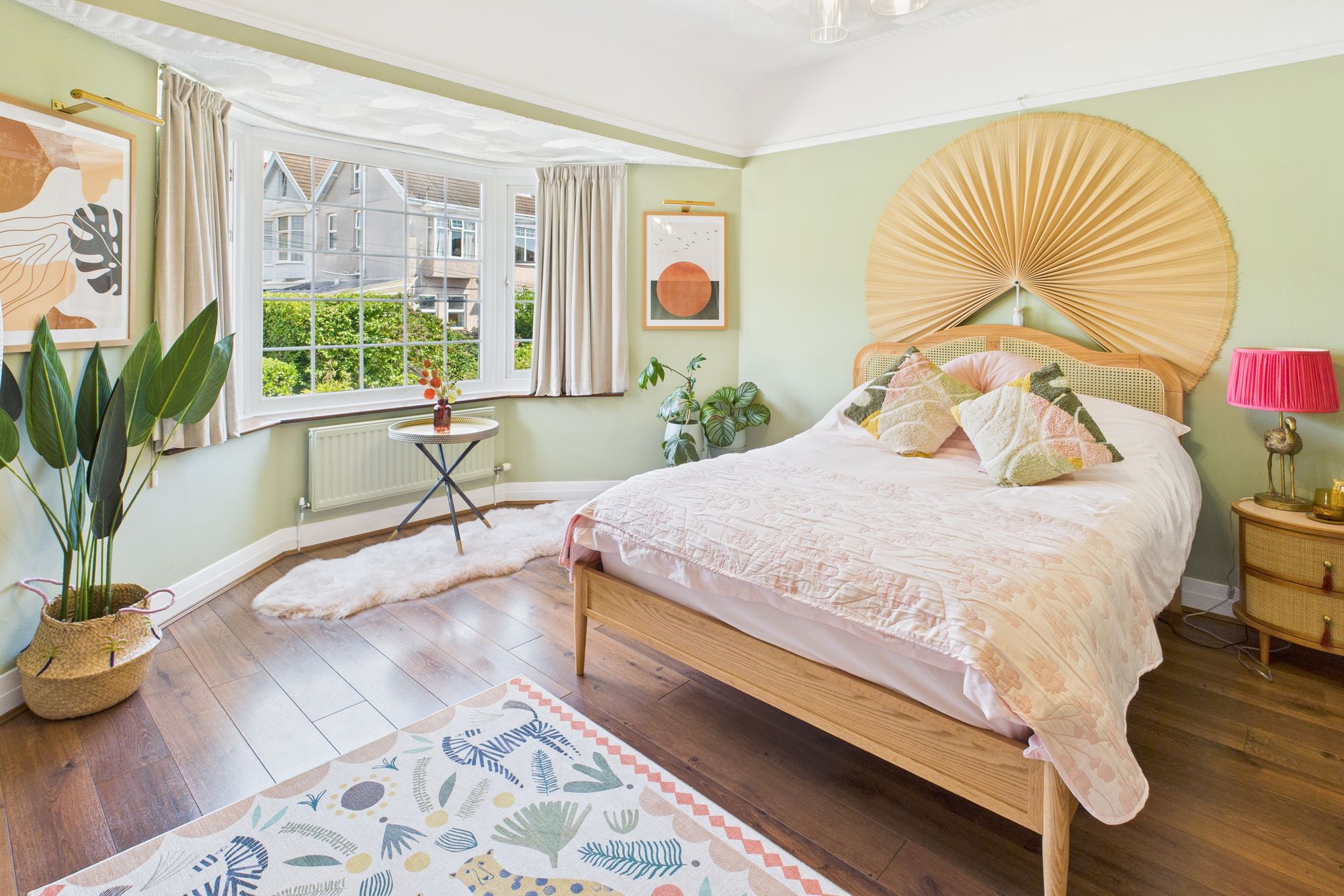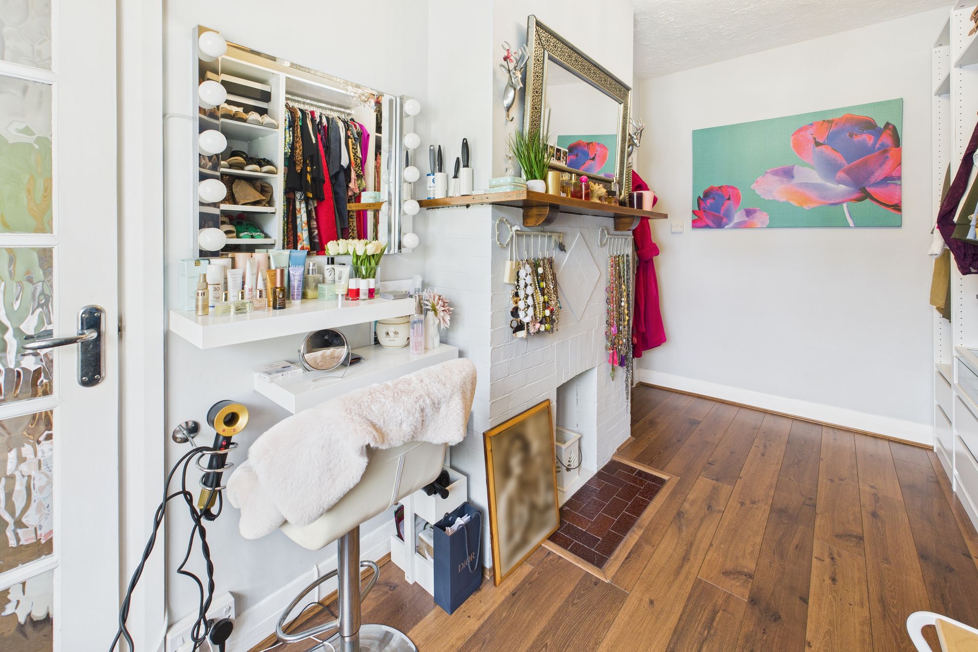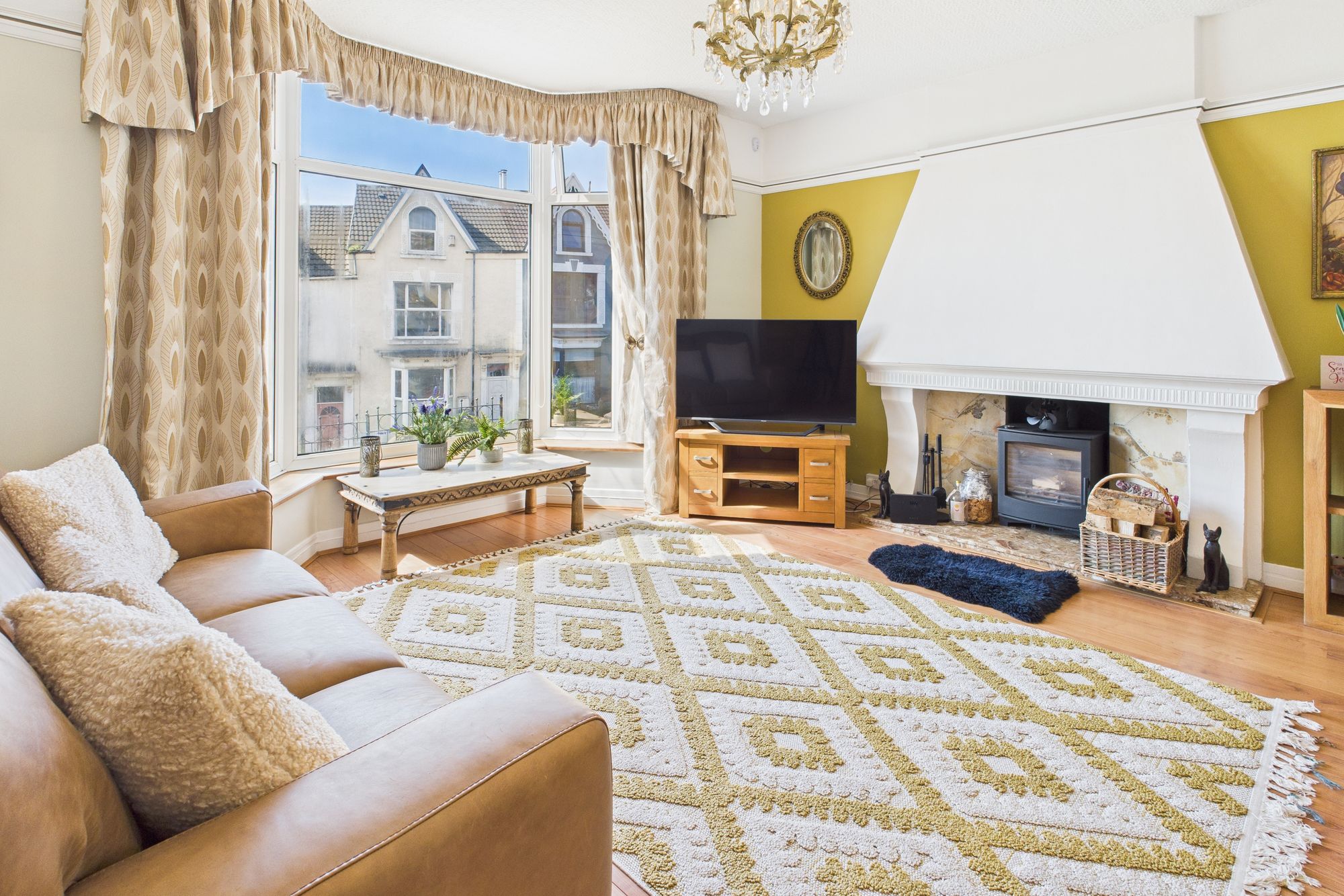 The elegant bay-fronted lounge is bathed in natural light, the room features a statement fireplace, wood floors, and charming period detailing.