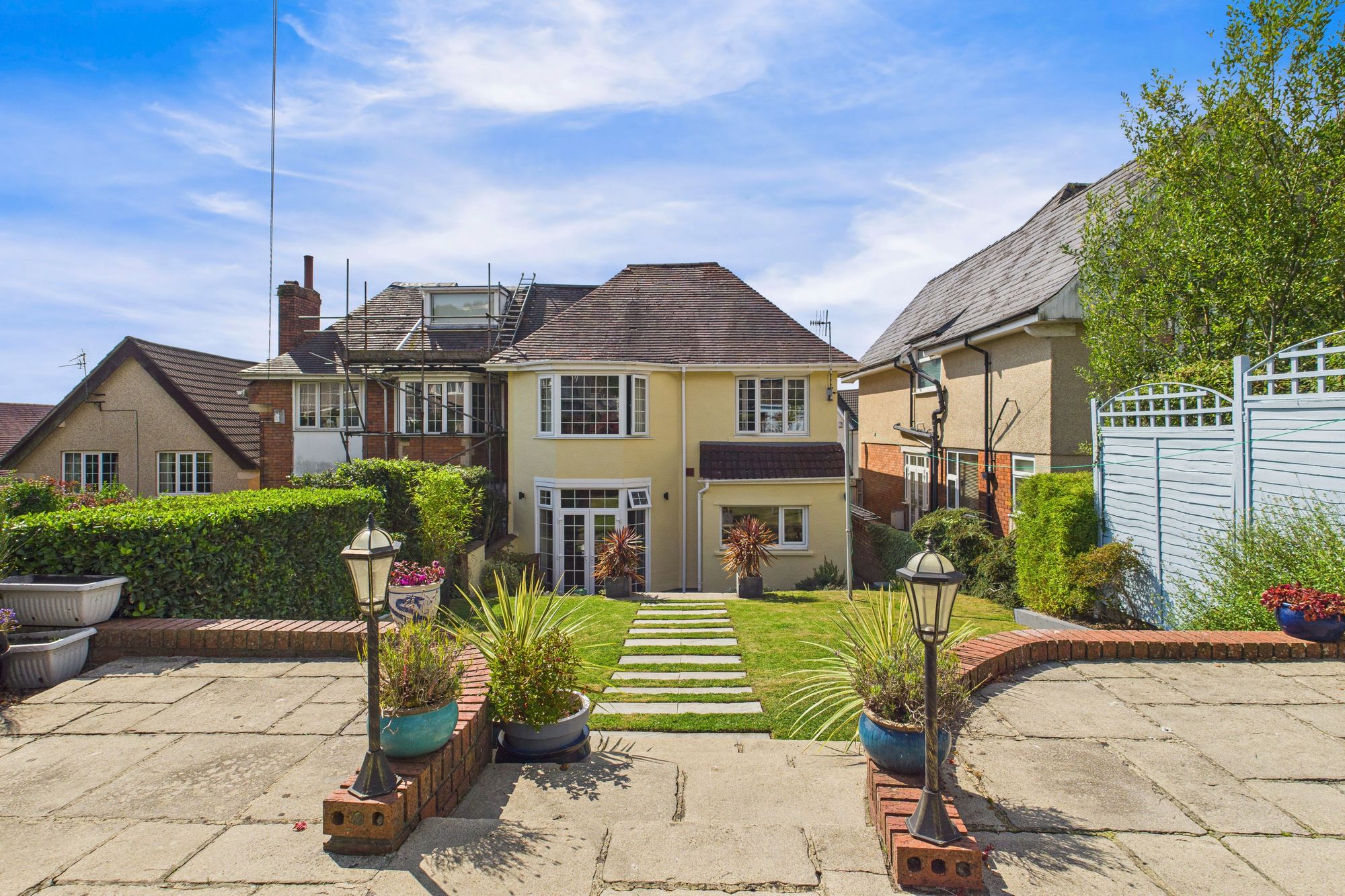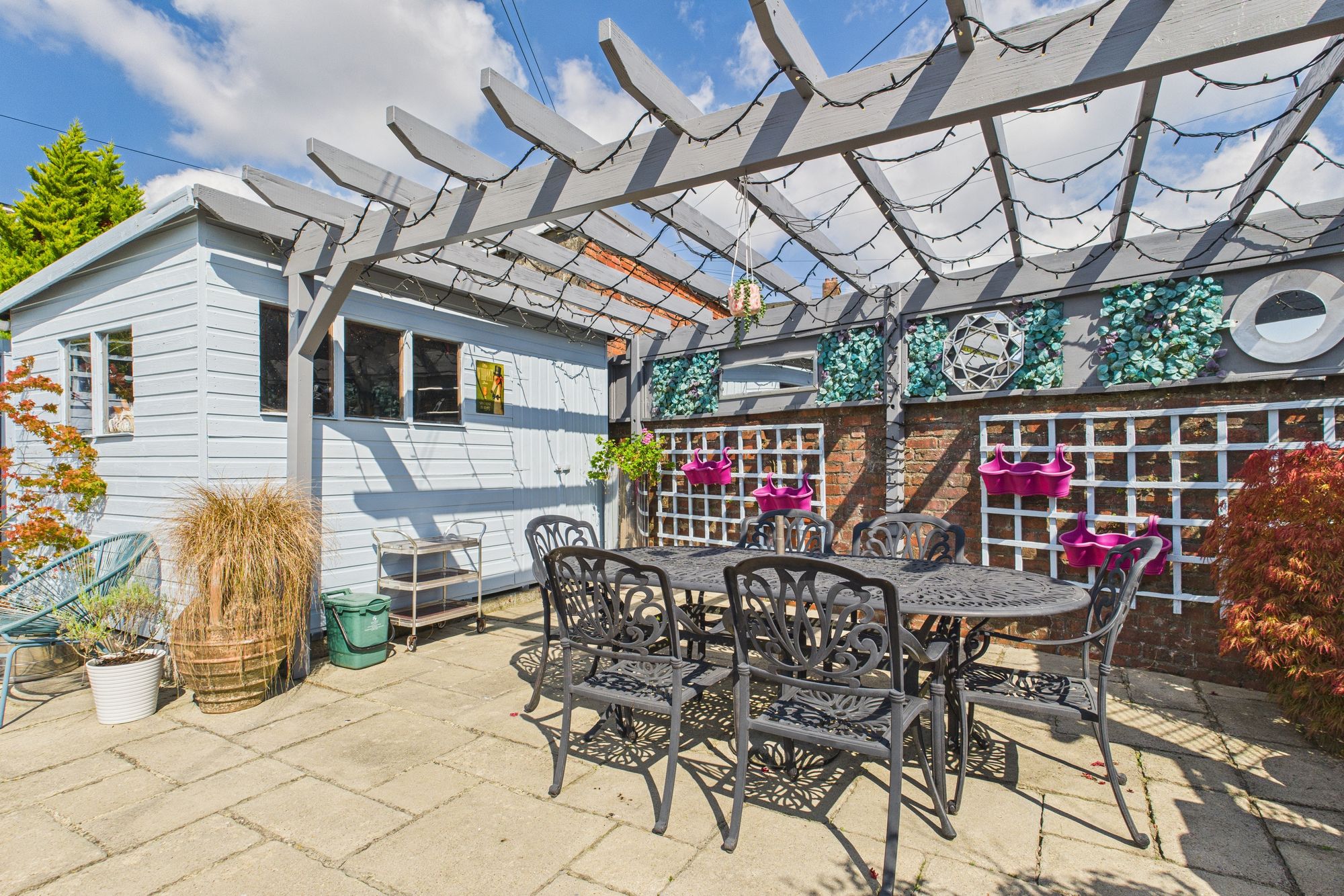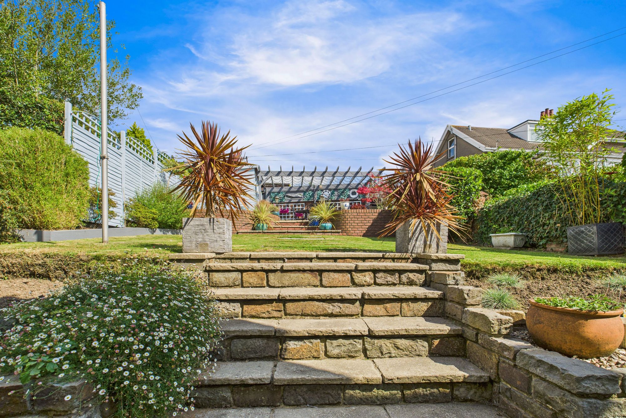 The garden is beautifully landscaped, the multi-level garden complete with patio seating areas, mature planting, and a charming pergola. Ideal for outdoor dining and relaxation.